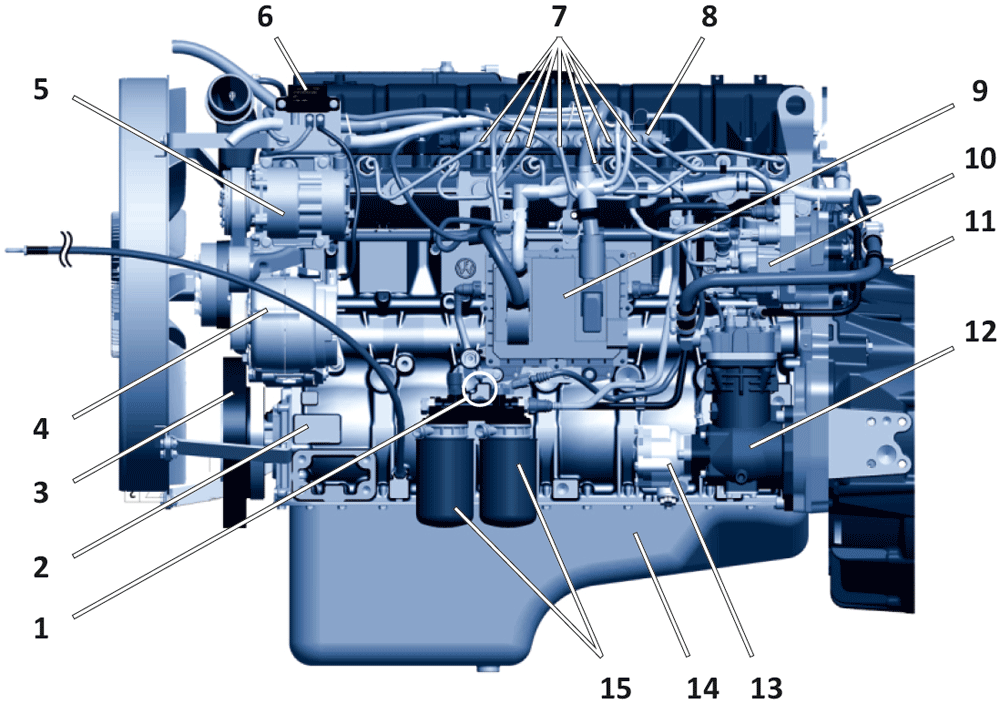 1. датчик давления и температуры топлива; 2. место установки заводской таблички; 3. гаситель крутильных колебаний; 4. генератор; 5. компрессор кондиционера; 6. реле предпускового подогревателя; 7. топливные трубки высокого давления; 8. рампа; 9. электронный блок управления; 10. насос топливный высокого давления; 11. датчик частоты вращения распределительного вала; 12. компрессор пневмотормозов; 13. насос гидроусилителя руля (НГУР); 14. картер масляный; 15. фильтр тонкой очистки топлива.