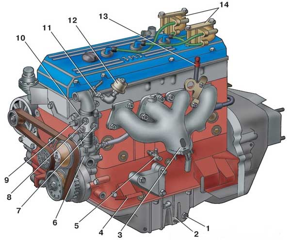 Двигатели модели ЗМЗ-4061.10 и 4063.10 (вид слева): 1 — сливная пробка; 2 — масляный картер; 3 — выпускной коллектор; 4 — кронштейн опоры двигателя; 5 — кран слива охлаждающей жидкости; 6 — водяной насос; 7 — датчик аварийной температуры охлаждающей жидкости; 8 — датчик указателя температуры охлаждающей жидкости; 9 — датчик температурного состояния двигателя; 10 — корпус термостата; 11 — датчик аварийного давления масла; 12 — датчик указателя давления масла; 13 — указатель (щуп) уровня масла; 14 — катушка зажигания.