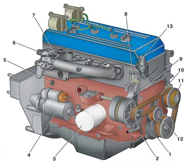 Двигатели модели ЗМЗ-4061.10 и 4063.10 (вид справа): 1 — диск синхронизации; 2 — датчик синхронизации; 3 — масляный фильтр; 4 — стартер; 5 — датчик детонации; 6 — трубка слива охлаждающей жидкости из отопителя; 7 — впускная труба; 8 — гидронатяжитель цепи; 9 — генератор; 10 — ремень генератора; 11 — шкив водяного насоса; 12 — натяжной ролик; 13 — бензонасос.