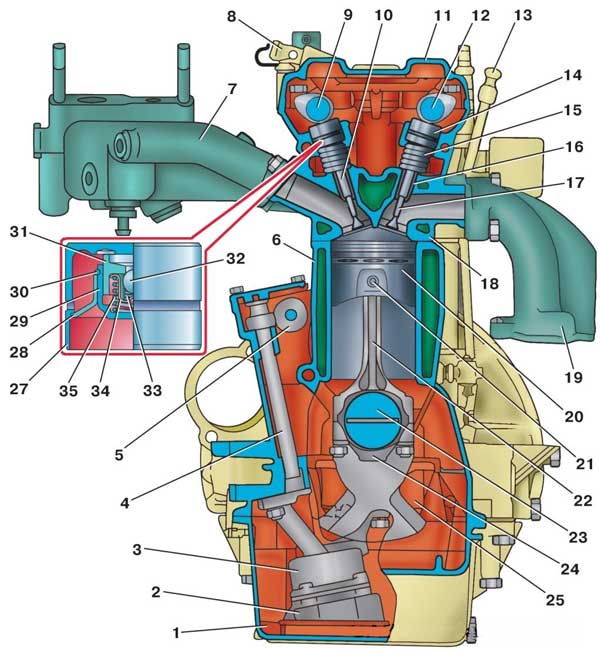 Поперечный разрез ЗМЗ-4061.10 и 4063.10: 1 — масляный картер; 2 — приемник масляного насоса; 3 — масляный насос; 4 — привод масляного насоса; 5 — шестерня промежуточного вала; 6 — блок цилиндров; 7 — впускная труба; 8 — патрубки вентиляции; 9 — распределительный вал впускных клапанов; 10 — впускной клапан; 11 — крышка клапанов; 12 — распределительный вал выпускных клапанов; 13 — указатель (щуп) уровня масла; 14 — гидротолкатель клапана; 15 — наружная пружина клапана; 16 — направляющая втулка клапана; 17 — выпускной клапан; 18 — головка блока цилиндров; 19 — выпускной коллектор; 20 — поршень; 21 — поршневой палец; 22 — шатун; 23 — коленчатый вал; 24 — крышка шатуна; 25 — крышка коренного подшипника; 26 — сливная пробка; 27 — корпус толкателя; 28 — направляющая втулка; 29 — корпус компенсатора; 30 — стопорное кольцо; 31 — поршень компенсатора; 32 — шариковый клапан; 33 — пружина шарикового клапана; 34 — корпус шарикового клапана; 35 — разжимная пружина.