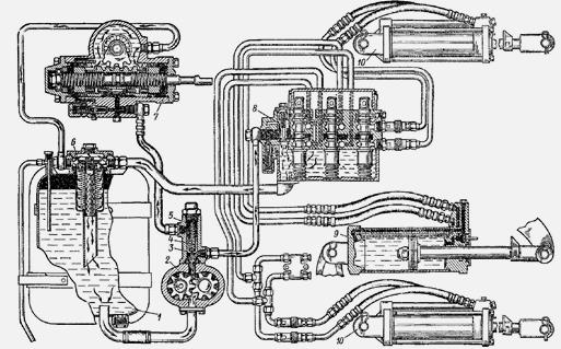 Масло из гидробака 1 поступает к шестеренному насосу 2, который нагнетает его в клапан 3 деления потока. Клапан делит поток масла на две части: одна поступает в гидрораспределитель 8 гидронавесной системы, другая — в гидроусилитель руля 7. Гидрораспределитель направляет поток масла либо в гидробак по сливному маслопроводу, либо в гидроцилиндр 9, либо через боковые или задние выводы непосредственно к гидроприводу сельскохозяйственной машины.