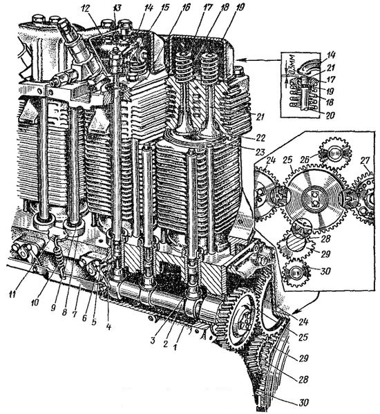 Механизм газораспределения трактора Т-40 Механизм газораспределения трактора Т-40: 1 — блок-картер; 2 — распределительный вал; 3 — толкатель клапана; 4, 9 — уплотнительные кольца; 5 — валик декомпрессора; 6 — рычаг; 7 — рейка; 8 — направляющая втулка толкателя; 10, 18, 20 — пружины; 11 — планка; 12 — крышка клапанов; 13 — регулировочный винт; 14 — коромысло клапана; 15 — штанга толкателя; 16 — кожух штанги; 17 — тарелка клапана; 19 — сухарь клапана; 21 — клапаны; 22 — седло клапана; 23 — поршень; 24 — шестерня распределительного вала; 25 — промежуточная шестерня распределения; 26 — шестерня привода насоса гидросистемы; 27 — шестерня привода топливного насоса; 28 — шестерня коленчатого вала; 29 — шестерня ведущая привода масляного насоса; 30 — шестерня ведомая привода масляного насоса. Техническое обслуживание механизма газораспределения заключается в проверке и регулировки зазоров клапанов, обеспечении нормальной смазки деталей распределительного вала и плотности прилегания клапанов к своим седлам. Рекомендуется через каждые 480 часов работы дизеля проверять и при необходимости регулировать зазор между торцами стержней клапанов и бойками коромысел. На не прогретом двигателе зазор клапанов Т-40 должен составлять 0,3 мм (впускного и выпускного).