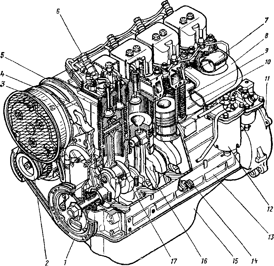 Производство – Владимирский тракторный завод. Базовая версия машины (Т-40 оснащена) двигателем Д-37 (производительность – 37 л.с., 27 кВт). Ее аналог Т-40М имеет двигатель Д-144 (50 л.с., 37 кВт). • Тип: дизельный • Количество цилиндров: 4 • Объем: 4,15 л • Диаметр цилиндра: 10,5 см • Ход поршня: 12,0 см • Частота: 1500 (37) и 1800 (50) об. в минуту • Крутящий момент: 192 и 205 • Удельный расход при экспл. мощности: не более 246/248 граммов на киловатт-час • Запуск: электростартер, бензиновый ПД8 • Тип охлаждения: воздушный Что же касается расхода топлива, то все зависит от нагрузки на двигатель, а также от того, какие работы трактор выполняет. Так, например, номинальная норма составляет 7,2 л./час. 1 — ведущий шкив привода вентилятора; 2 — генератор; 3 —1 вентилятор; 4 — передний дефлектор; 5 — головка цилиндра; 6 — форсунка; 7 — впускиой трубопровод; 8 — выпуски ой трубопровод; 9 — цилиндр; 10 — средний дефлектор; 11 — картер маховика; 12 ~~ топливные фильтры; 13 — картер дизеля; 14 — щуп-масломер; 15 — масляный картер; 16 — шатун; 17 — коленчатый вал.