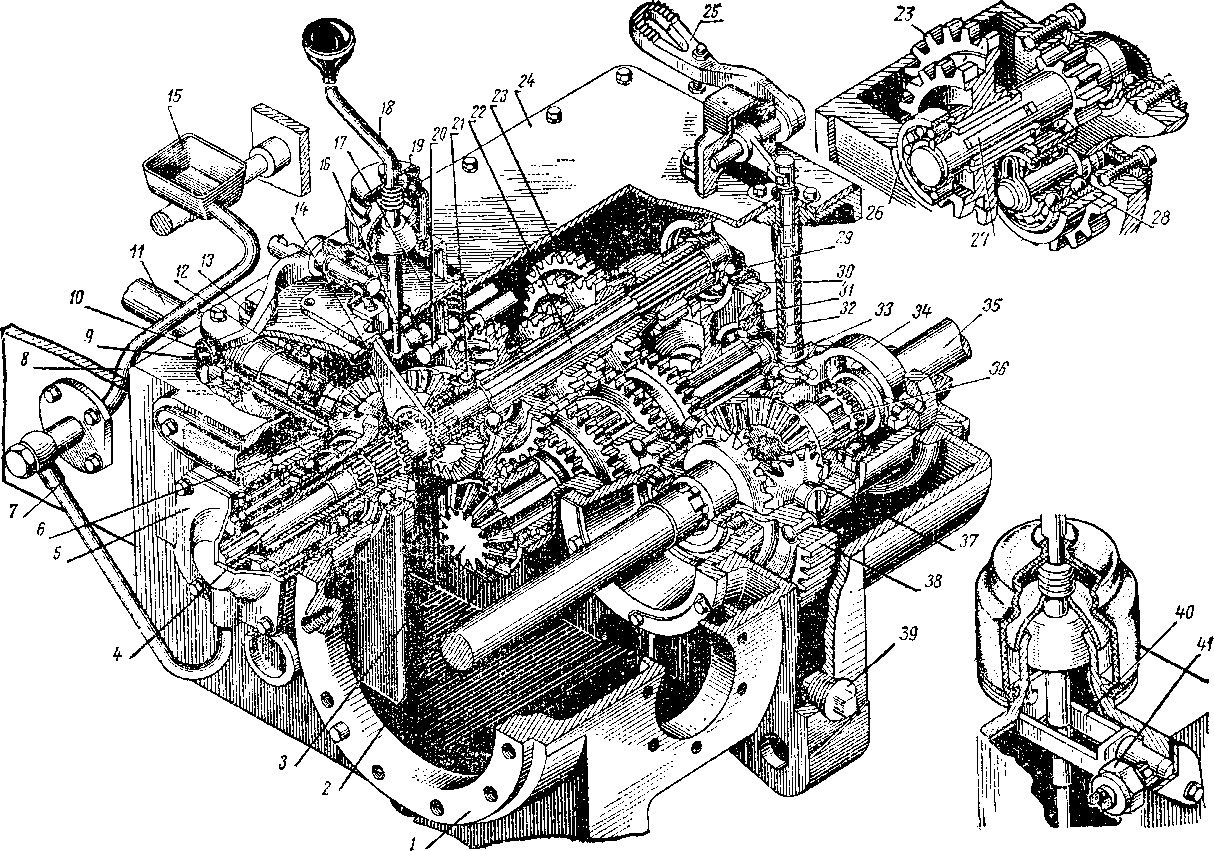 • Механическая, реверсивная. • коробка передач – четырехходовая, 8 скоростей, реверс, блокиратор. Расположение валов поперечное; • дифференциал – закрытый, двухсателлитный с принудительной блокировкой; • переключение передач; • главная передача: шестерни прямозубые цилиндрические; • центральная: шестерни спиральные конические. Допускается установка ходоуменьшителя (если скорость работы трактора намного ниже скорости его движения). Коробка передач: 1 — корпус трансмиссии; 2, 21, 26, 29, 32 — подшипникн; 3 — вторичный вал; 4 — ходоуменылитель; 5 —крышка ходоумекьши-теля; 6 — коническая шестерня реверса; 7 — трубопровод маслоприемника; S, 15 — маслоприемиики; 9— рычаг переключайся реверса и ходоуменьшителя; 10 — ведущая коническая шестерня: 11 — вал муфты главного сцепления; 12 — муфта реверса; 13 ~— пробка-сапун; 14 — вилка переключения реверса; 16 — ведомая коническая шестерня; 17 — кулиса; 18—рычаг переключения передач; 19 — чехол; 20 — валик механизма переключения; 22 — первичный вал; 23 — блок шестерен заднего хода; 24— крышка корпуса трансмиссии; 25 — педаль блокировки дифференциала; 27 — вал-шестерня замедленной передачи; 28 — промежуточная шестерня замедленной передачи; 30, 31 — стаканы подшипников; 33 — шток; 34 — вилка; 35 — полуось; 36 — зубчатая муфта блокировки дифференциала; 37 — дифференциал; 38 —• ведомая цилиндрическая шестерня промежуточной передачи; 39 — пробка сливного отверстия; 40 — качающаяся рамка; 41 — выключатель четырехходовая с поперечным расположением валов.