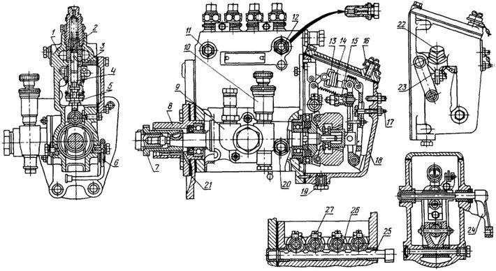 Схема топливного насоса УТН 5 дизеля Д-240: 1 — корпус; 2 — нагнетательный клапан; 3 — плунжерная пара; 4 — плунжер; 5 — болт толкателя; 6 - кулачковый вал; 7 — шлицевая втулка; 8 — установочный фланец; 9 — подкачивающий насос; 10 — насос ручной подкачки; 11 — пробка выпуска воздуха; 12 — перепускной клапан; 13 — серьга; 14 — пружина регулятора; 15 — корректор; 16 — сапун; 17 - болт номинала; 18 — корпус регулятора; 19 — сливная пробка; 20 — пробка контрольного отверстия; 21 — плита; 22 — пробка сливной горловины; 23 — болт максимальной частоты вращения; 24 — рычаг управления; 25 — зубчатая рейка; 26 — зубчатый венец; 27 — стяжной винт.