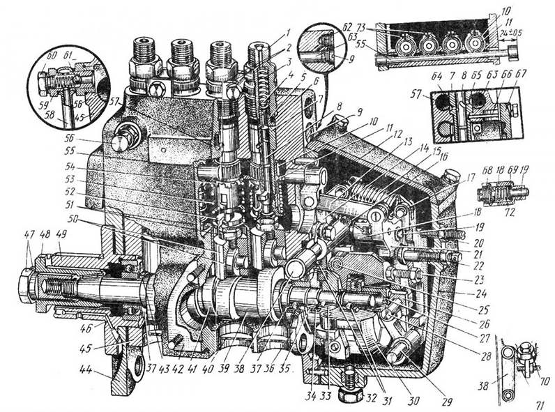 1 - нажимной штуцер; 2 - зажимы; 3 - пружина; 4 - нагнетательный клапан; 5 - седло клапана; 6 - прокладка; 7 - втулка плунжера; 8 - плунжерная пара; 9 - пробка; 10 - зубчатый венец; 11 - поворотная втулка; 12 - крышка регулятора; 13 - тяга рейки; 14 - рычаг пружины; 15 - пружина регулятора; 16 - пружина обогатителя; 17 - основной рычаг; 18 - корпус корректора; 19 - шток корректора; 20 - винт регулировочный; 21 -промежуточный рычаг; 22 - болт номинала; 23 - болт; 24 - корпус регулятора; 25 - ось груза; 26 - пята; 27 - муфта; 28 - ось пяты; 29 - ось рычага; 30 - грузы регулятора; 31 - упорные шарикоподшипники; 32 - спускная пробка; 33 - ступица грузов; 34 - сухарь амортизатора; 35 - шайба; 36 - стакан подшипника; 37 - маслоотражатель; 38 - рычаг управления; 39 - кулачковый вал; 40 - заглушка; 41 - эксцентрик привода подкачивающего насоса; 42 - фланец для крепления подкачивающего насоса; 43 - регулировочная шайба; 44 - плита крепления; 45 - корпус насоса; 46 - маслоподводящее отверстие; 47 - гайка валика; 48 - шлицевая втулка; 49 - установочный фланец; 50 - толкатель с роликом; 51 - регулировочный болт толкателя; 52 - тарелка пружины (нижняя); 53 - пружина плунжера; 54 - тарелка пружины; 55 - зубчатая рейка; 56 - болт для спуска воздуха; 57 - канал для отвода топлива; 58 - перепускная трубка; 59 - корпус перепускного клапана; 60 - пробка; 61 - шарик-клапан; 62 - отверстие для подвода топлива; 63 - канал для подвода топлива; 64 - отсечное отверстие; 65 - впускное отверстие втулки плунжера; 66 - штифт; 67 - крышка люка; 68 - регулировочный винт; 69 - прокладка; 70 - заливная пробка; 71 - регулировочный винт; 72 - пружина корректора; 73 - стяжной винт.