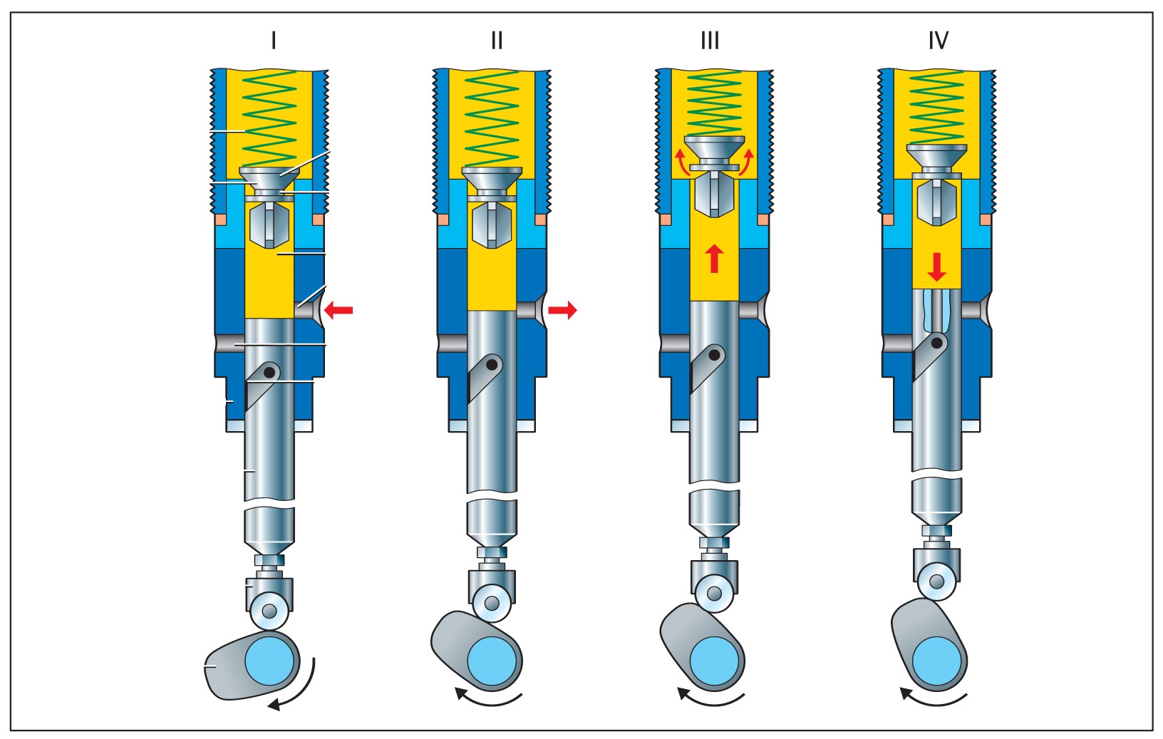 При прекращении подачи топлива плунжером находящаяся под клапаном пружина передвигает его вниз. Одновременно с этим разгрузочный поясок сперва разъединяет топливопровод высокого давления от надплунжерной области, а затем, продолжая двигаться вдоль отверстия седла клапана, выполняя роль поршня — откачивает из топливопровода часть топлива, резко понижая тем самым давление. Благодаря данному действию происходит резкое прекращение подачи топлива.