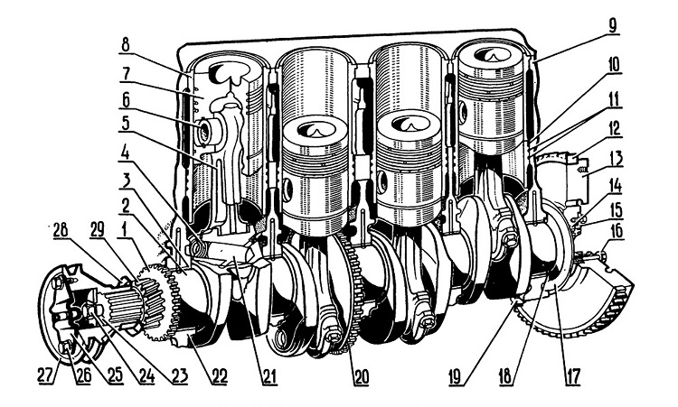 Кривошипно-шатунный механизм двигателя А-41: 1 — шестерня привода масляного насоса; 2 — вал коленчатый; 3 — вкладыш коренного подшипника; 4— заглушка; 5 — шатун; 6 — палец поршневой; 7 — поршень; 8 — гильза цилиндра; 9 — блок-картер; 10 — кольцо антикавитационное; 11 — кольца уплонительные гильзы цилиндра, 12 — венец маховика; 13 — маховик; 14 — подшипник; 15 — корпус сальника с манжеткой; 16 — болт крепления маховика; 17 — маслоотражатель; 18 — полукольцо упорное; 19 — болт крепления крышки коренного подшипника; 20 — шестерня привода механизма уравновешивания; 21 — полость для центробежной очистки масла; 22 — крышка коренного подшипника; 23 — шайба поджимная; 24 — болт; 25 — храповик; 26 — болт; 27 — шкив коленчатого вала; 28 — маслоотражатель; 29 — шестерня коленчатого вала.