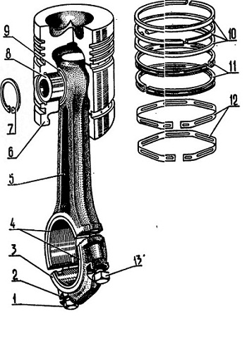Поршень в сборе с шатуном двигателя А-41: 1 — болт шатунный длинный; 2 — шайба стопорная; 3 — крышка шатуна; 4 — вкладыш шатунного подшипника; 5 — шатун; 6 — поршень; 7 — кольцо стопорное поршневого пальца; 8 — палец поршневой; 9 — втулка шатуна; 10 — кольца поршневые компрессионные; 11 — кольца поршневые маслосъемные; 12 — расширители радиальные маслосъемных колец; 13 — болт шатунный короткий.