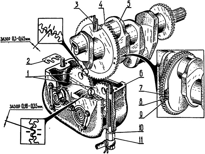 Механизм уравновешивания: 1 — груз шестерни; 2 — прокладка регулировочная; 3 — штифт; 4 — шестерня привода механизма уравновешивания: 5 — вал коленчатый; 6 — корпус; 7 — шайба замковая: 8 — болт; 9 — шайба упорная; 10 — шайба; 11 — болт.