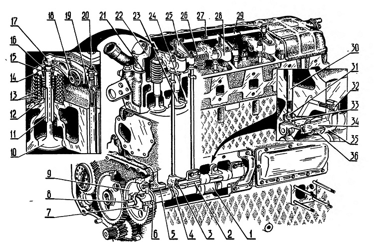 Механизм газораспределения с верхним расположением клапанов в головке цилиндров и нижним расположением распределительного вала. Механизм состоит из впускных и выпускных органов и деталей, передающих к ним движение от коленчатого вала: штанг, толкателей, коромысел, распределительного вала и шестерен. Распределительный вал 1 — стальной, с закаленными опорами и кулачками. Вращение распределительному валу передается от коленчатого вала парой косозубых шестерен. Осевое смещение распределительного вала ограничивается упорной шайбой 6. Привод клапанов осуществляется через качающиеся роликовые толкатели 36, трубчатые штанги 30 с запрессованными в них наконечниками 19, 31 и коромысла 17 с регулировочными винтами 20, служащими для установки теплового зазора. Движение от распределительного вала передается к толкателю через ролик, установленный на игольчатых подшипниках. Для повышения работоспособности в толкатель запрессована каленая стальная пята 33, которая служит упорным подшипником для штанг. Толкатели качаются на оси 34, которая с помощью упор 2 крепится к блок-картеру. На двигателе установлены две оси толкателей. Коромысла клапанов 17 представляют собой двуплечие рычаги, имеющие каналы, по которым масло поступает для смазки поверхностей трения клапанов. Впускной и выпускной клапаны 10, 23 изготовлены из жаростойкой стали. Во время работы двигателя замок клапанов может вращаться для обеспечения равномерного износа торца стержня клапана и рабочей фаски на тарелке клапана. Вращение достигается установкой промежуточной втулки 15 между тарелкой пружин 14 и сухариками 16.