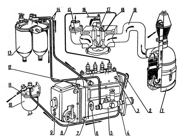 Система питания двигателя А-41: 1 — воздухоочиститель; 2 — топливопровод перепуска топлива из головки топливного насоса в топливоподкачивающий насос; 3 — пробка для выпуска воздуха; 4 — топливный насос высокого давления; 5 — топливоподкачивающий насос; 6 — трубка дренажная; 7 — пробка сливная; 8 — регулятор частоты вращения; 9 — пробка контрольная; 10 — фильтр грубой очистки топлива; 11 — топливопровод от бака к фильтру грубой очистки; 12 — пробка заливная; 13 — фильтр тонкой очистки топлива 2СТФ-3; 14 — топливопроводы низкого давления; 15 — коллектор выпускной; 16 — топливопровод слива; 17 — форсунка; 18 — топливопровод высокого давления;