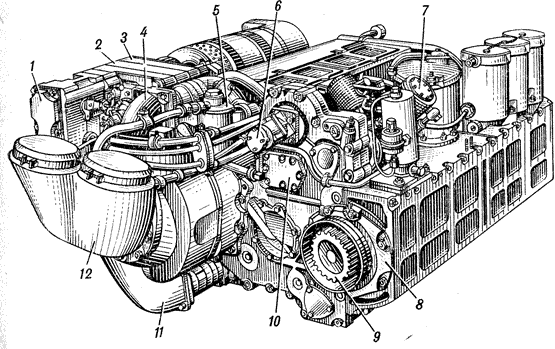 Двигатель 5ТДФ (вид со стороны нагнетателя)1 — регулятор; 2 — крышка передачи; 3 — плита передачи; 4 — верхний патрубок нагнетателя; 5 — сапун; 6 — датчик тахометра; 7 — компрессор; 8 — опорный бугель; 9 — зубчатая муфта отбора мощности; 10—масляный насос сапуна; 11 — нижний патрубок нагнетателя; 12 — нагнетатель.Характеристики двигателя 5ТДФ и его модификаций