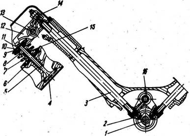 1 — распределительный вал; 2 — толкатель; 3 — штанга толкателя; 4 — клапан; 5 — направляющая втулка; 6 — шайба пружин клапана; 7 — наружная пружина; 8 — внутренняя пружина; 9 — тарелка пружин клапана; 10 — втулка тарелки пружин клапана; 11 —сухарь; 12 — коромысло; 13 —ось коромысла; 14 — регулировочный винт; 15 — уплотнительная манжета впускного клапана; 16 — ось толкателей.