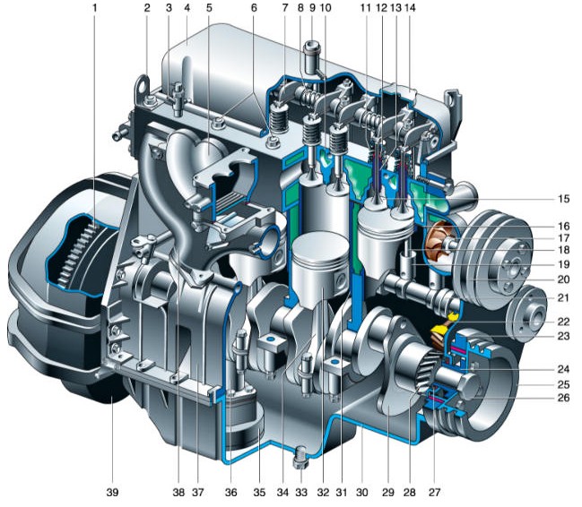 1 — маховик; 2 — монтажная проушина; 3 — кран отопителя; 4 — крышка головки блока цилиндров; 5 — впускной трубопровод; 6 — гайки шпилек крепления головки блока цилиндров; 7 — коромысло клапана; 8 — ось коромысел; 9 — патрубок вентиляции картера; 10 — головка блока цилиндров; 11 — пружины клапана; 12 — маслоотражательный колпачок; 13 — втулка клапана; 14 — крышка маслозаливной горловины; 15 — клапан; 16 — прокладка головки блока цилиндров; 17 — насос охлаждающей жидкости; 18 — штанга; 19 — толкатель; 20 — шкив вентилятора; 21 — распределительный вал; 22 — ведомая шестерня привода распределительного вала; 23 — демпфер крутильных колебаний; 24 — ступица шкива; 25 — шкив; 26 — болт шкива; 27 — манжета; 28 — ведущая шестерня привода распределительного вала; 29 — коленчатый вал; 30 — поддон картера; 31 — гильза цилиндра; 32 — поршень; 33 — пробка маслосливного отверстия; 34 — шатун; 35 — маслозаборник; 36 — масляный насос; 37 — блок цилиндров; 38 — выпускной коллектор; 39 — картер сцепления.