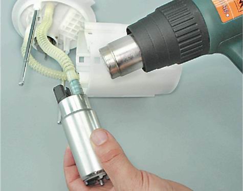 5. Феном разогреваем конец гофротрубки надетой на патрубок бензонасоса.