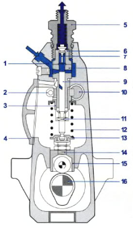 Рядные ТНВД серии РЕ имеют собственный кулачковый вал 14, который установлен в алюминиевом корпусе. Он соединяется с двигателем либо непосредственно, либо через соединительный узел и муфту опережения впрыскивания. Количество кулачков на кулачковом валу TНВД соответствует числу цилиндров двигателя. Над каждым кулачком находится роликовый толкатель 13 с тарелкой 12 пружины 11. Тарелка передает усилие от толкателя на плунжер 8, а пружина возвращает его в исходное положение. Гильза 4 плунжера является направляющей, в которой плунжер совершает возвратно-поступательное движение. Сочетание втулки и плунжера образует насосный элемент, или плунжерную пару.1. Корпус нагнетательного клапана 2. Проставка 3. Пружина нагнетательного клапана 4. Гильза плунжера 5. Конус нагнетательного клапана 6. Впускное и распределительное отверстия 7. Регулирующая кромка плунжера 8. Плунжер 9. Регулирующая втулка плунжера 10. Поводок плунжера 11. Пружина плунжера 12. Тарелка пружины 13. Роликовый толкатель