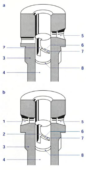 Плунжер притерт к гильзе так плотно, что пара герметична без дополнительных уплотнений даже при очень высоких давлениях и низких частотах вращения коленчатого вала. Из-за этого замене могут подвергаться только комплектные плунжерные пары.Величина возможной подачи топлива зависит от рабочего объема пары. Максимальное значение давления впрыскивания у форсунки может составлять, в зависимости от конструкции, 400... 1350 бар. Угловой сдвиг кулачков на кулачковом валу гарантирует точное совмещение впрыскивания с фазовым сдвигом процессов по цилиндрам двигателя в соответствии с порядком его работы.а - гильза с одним подводящим каналом b - гильза с двумя подводящими каналами 1. Подводящий канал 2. Продольная канавка 3. Гильза плунжера 4. Плунжер 5. Перепускном канал 6. Регулирующая кромка 7. Спиральная канавка 8. Кольцевая канавка для смазки