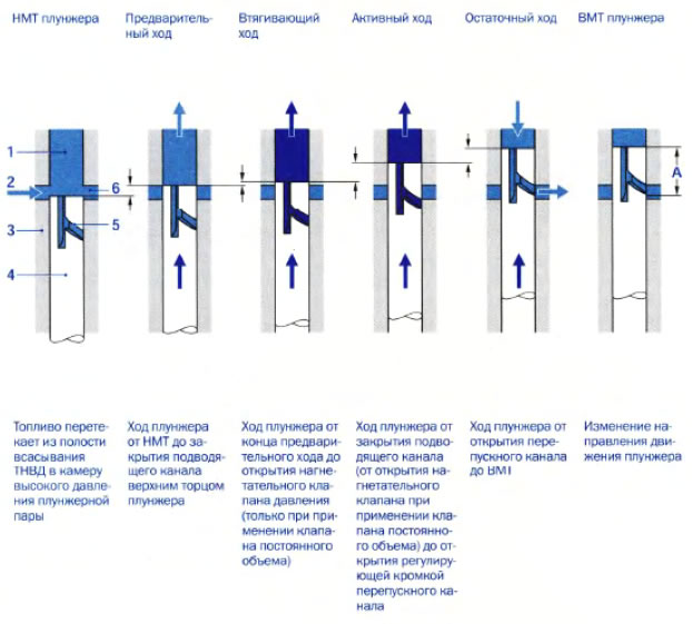 1. Камера высокого давления 2. Подводящий канал 3. Гильза плунжера 4. Плунжер 5. Регулирующая кромка 6. Перепускной капал А полный ход плунжера