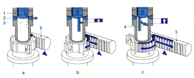 Величину цикловой подачи топлива можно регулировать изменением активного хода кромки. Для этого рейка 5 через регулирующую втулку плунжера поворачивает сам плунжер 3 таким образом, что регулирующая кромка 4 может изменять момент конца нагнетания и вместе с тем величину цикловой подачи (регулирование по концу впрыскивания). В крайнем положении, соответствующем нулевой подаче (а), продольная канавка находится непосредственно перед перепускным каналом. Вследствие этого давление в камере высокого давления плунжерной пары во время всего хода плунжера равняется давлению в полости всасывания и нагнетания топлива не происходит. В это положение плунжер приводится, если двигатель должен быть остановлен. При средней подаче (Ь) плунжер устанавливается в промежуточное положение (по регулирующей кромке). Полная подача (с) становится возможной только при установке максимального активного хода плунжера. Передача движения от рейки на плунжер может производиться либо через зубчатую рейку на зубчатый сектор , закрепленный на регулирующей втулке плунжера либо через рейку с направляющими шлицами на штифт или сферическую головку на регулирующей втулке плунжера.а - нулевая подача b - средняя подача с - полная подача 1. Гильза плунжера 2. Подводящий канал 3. Плунжер 4. Регулирующая кромка плунжера 5. Рейка ТНВД