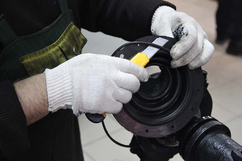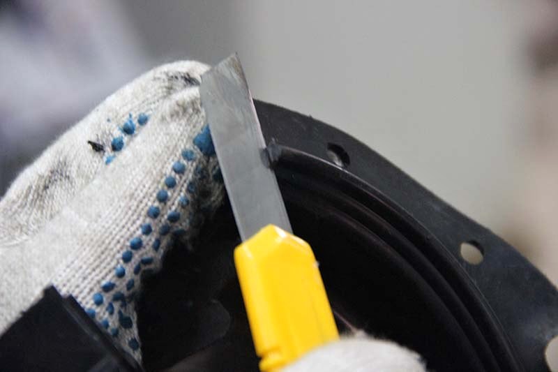 Внимание: Для тех, кто считает, что при установке пыльника поворотного кулака более правильно было бы оставлять родной сальник уплотнения и войлочную набивку, сообщаем, что такая возможность существует.Для того, чтобы установить пыльник поворотного кулака поверх заводского сальника, нужно с внутренней стороны срезать выступающую часть, которая прилегает к корпусу шара, и предназначена как раз для выполнения этой же функции - уплотнения за счёт плотного прилегания к поверхности. Срезать выступающую часть нужно хорошо заточенным острым лезвием. Наилучшим образом для этой цели подходит канцелярский нож. Главное не оставлять заусенцев и зазубрин, так как они могут стать причиной разрыва.При такой установке пыльник так же выполняет свою функцию - защиту узла от грязи и воды. При этом внутреннее уплотнение всегда будет работать в чистой смазке и не будет изнашиваться. При этом необходимо заменить болты крепления прижимных пластин на более длинные.