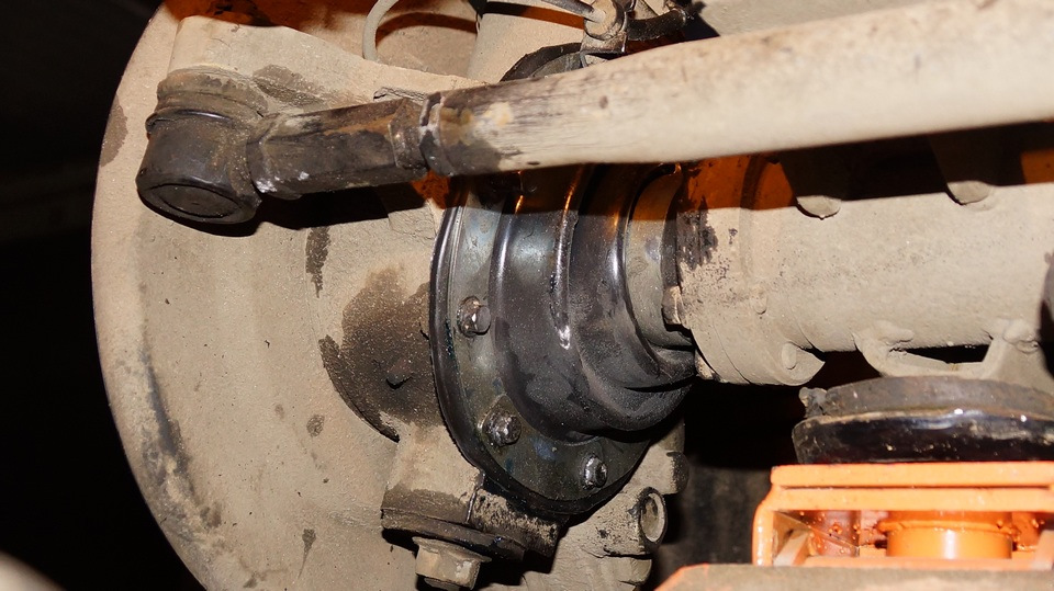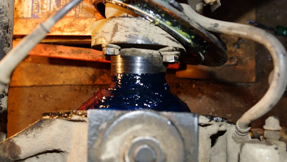 Левая сторона до установкиСтандартный пыльник снят и висит на мосту — он так и будет на всех фотографиях. Распилил его после окончательной установки пыльника.Смазку в пыльник.Смазку на кулак. Старую смазку повыскребал, сколько смог.Другой ракурс.Пыльник на месте.![]()