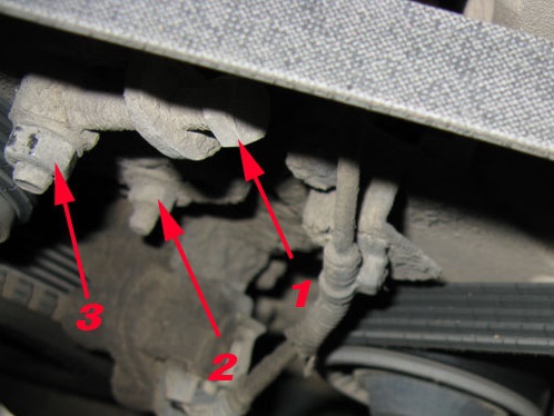После замены ремня генератора, ремень кондиционера устанавливаем в обратной последовательности и производим его натяжение. Для проверки натяжения ремня нажимаем пальцем руки на ремень посередине между шкивами компрессора и коленчатого вала. При усилии нажатия около 10 кгс прогиб ремня должен составлять около 8,0 мм.