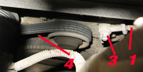 Замена ремня привода генератора на Шевроле Нива своими руками в общем простая процедура. Для снятия износившегося ремня необходимо сначала его ослабить. Для этого нужно ослабить (не до конца, а до момента, дающего возможность снять ремень с натяжного ролика) регулировочный болт натяжного ролика (цифра 1 на фото) и ослабить 3 гайки (одна на 13 – цифра 3 на фото и 2 на 10 цифра 2 и 4 ) натяжной планки.![]()