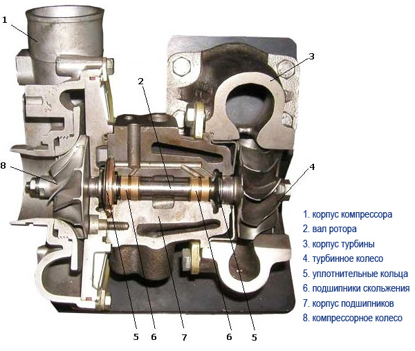 Устройство турбокомпрессора в разрезеИспользование иных масляных уплотнений в турбокомпрессорах (например сальников, манжет и т.д.) не представляется возможным из-за огромных скоростей вращения валов, при которых контактные системы уплотнений во-первых создадут слишком большое сопротивление вращению вала, во-вторых слишком быстро выйдут из строя. Правда существуют так называемые карбоновые масляные уплотнения — аналог сальниковых уплотнений (такие уплотнения применяются в автомобильных водяных насосах), но карбоновые уплотнения применяются только на низкооборотистых турбинах (до 80 тыс. об/мин), и то далеко не на всех. Итак, основным условием нормальной работы турбокомпрессора (в плане отсутствия утечек масла) является нормальная работа его динамических уплотнений. Динамические уплотнения, в свою очередь, могут нормально работать только в воздушном пространстве, то есть только тогда, когда внутренняя полость корпуса подшипников свободна от моторного масла. Если корпус подшипников по каким-либо причинам заполняется ("подпирается") маслом или нарушается баланс давлений внутри корпуса подшипников и извне его, динамические уплотнения практически перестают работать, происходит утечка масла через уплотнительные кольца в корпус комрессора и в корпус турбины.Рассмотрим причины, по которым возникает такая ситуация