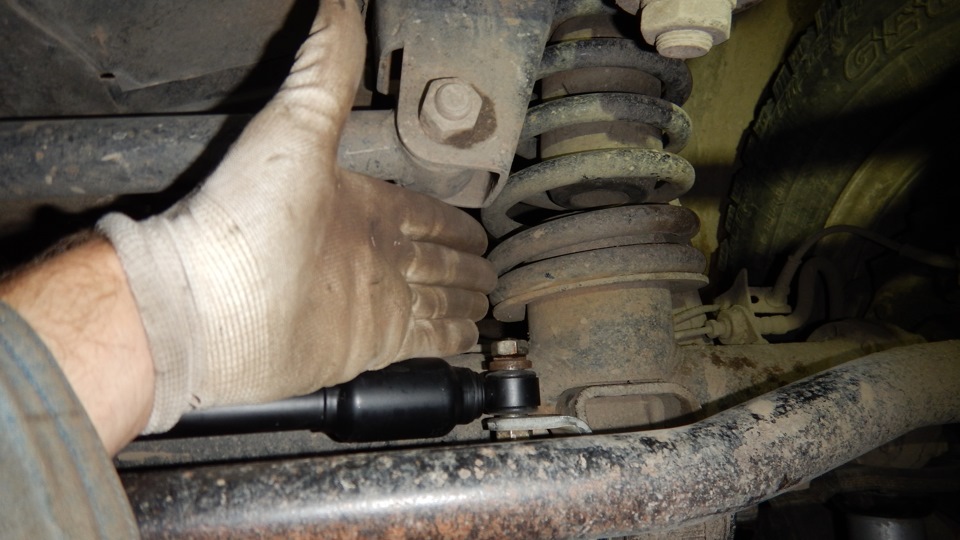 После окончательной сборки поддомкратил левое переднее колесо на сколько позволил имеющийся у меня подкатной домкрат. Расстояние между чашкой пружины и отбоиником получилось около 1 сантиметра и при этом между демпфером и кронштейном тяги проходит ладонь. Думаю что демпфер не повредиться, а если повредиться то цена его не так уж и велика (1100р), тогда переделаю его крепеж.