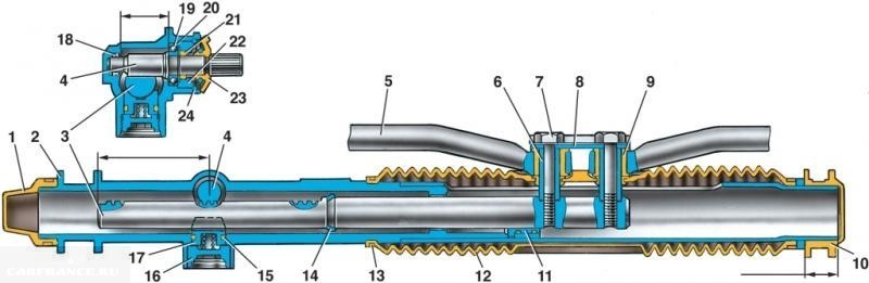 Устройство рулевой рейки обуславливается валом рулевой колонки, который имеет на конце зубчатый механизм, соединенный с подобным механизмом, расположенным на самой рейке. Соответственно, движения руля заставляют двигаться рулевые тяги, а те, в свою очередь, меняют угол поворота колес. Прежде чем приступить непосредственно к процессу проверки необходимо знать конструктивные особенности рулевой рейки. Рассмотрим, из каких элементов она состоит:1 – защитный колпак; 2 – картер рулевого механизма; 3 – рейка; 4 – приводная шестерня; 5 – внутренний наконечник рулевой тяги; 6 – распорная втулка; 7 – болт крепления рулевой тяги; 8 – соединительная пластина; 9 – опорная втулка; 10 – опора рулевого механизма; 11 – опорная втулка рейки; 12 – защитный чехол; 13 – хомут; 14 – ограничительное кольцо рейки; 15 – уплотнительное кольцо упора рейки; 16 – гайка; 17 – упор рейки; 18 – роликовый подшипник; 19 – шариковый подшипник; 20 – стопорное кольцо; 21 – уплотнительное кольцо гайки; 22 – гайка крепления подшипника шестерни; 23 – пыльник; 24 – стопорная шайба.