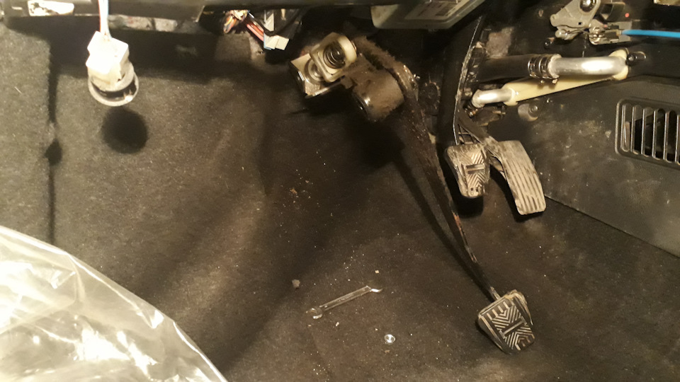 Педаль демонтирована, продолжаем работу. Снимаем теперь пластмассу тросика с педали. Не потеряйте маленький черный фиксатор.
