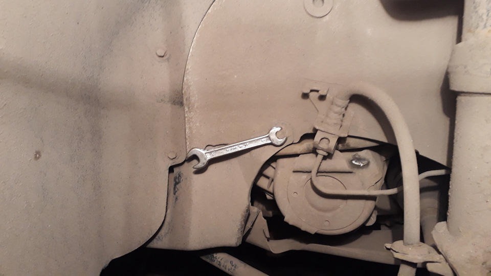 Снимаем колесо и ключом на 8 откручиваем крепление пластиковой защиты. Под капотом откручиваем пластиковый поводок и выталкиваем тросик из направляющей скобы в сторону снятого колеса.