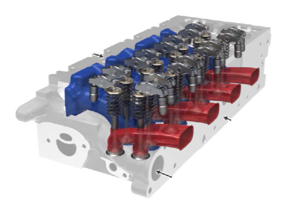 ГБЦ. Впускной и выпускной клапаны ГБЦ расположены один за другим. Такое расположение приводит к смешанному распределительному валу, каждый из которых имеет управление впуском и выпуском. Так как узел клапана был изменен по сравнению с его предшественником, каналы должны были быть перепроектированы, с акцентом на увеличение максимального потока с хорошими показателями завихрения.