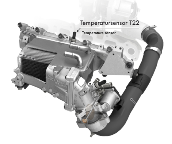 Впускной коллектор со встроенным промежуточным охладителем наддувочного воздуха. MDB TDI оснащен впускным коллектором со встроенным промежуточным охладителем наддувочного воздуха. Предшественник 2.0L TDI уже использовал косвенное водяное охлаждение наддувочного воздуха. Как дальнейшее развитие, охладитель наддувочного воздуха с водяным охлаждением для двигателя MDB - как и в двигателе TSI объемом 1,4 литра - встроен во впускной коллектор.