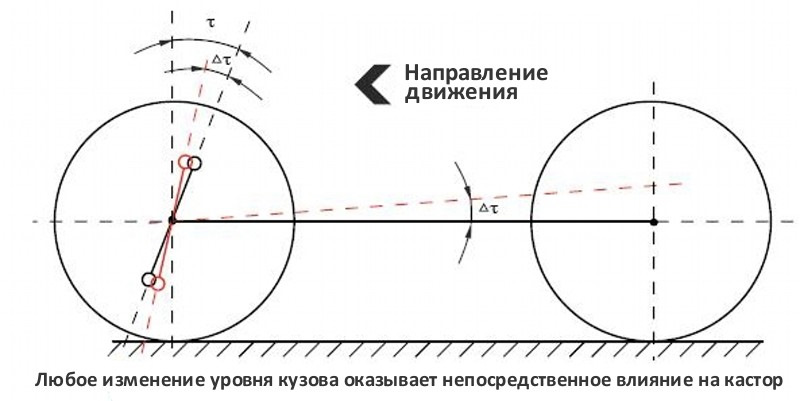 Принцип похожий, но здесь нюансов больше. Опять есть треугольник, только вместо рессоры и серьги имеем пружину и продольную штангу.Устройство передней подвески УАЗ ХантерПри установке более длинных пружин опять же меняется (увеличивается) угол между рамой и продольной штангой. Опять мост поворачивается. Только теперь при повороте моста не только ухудшается угол работы карданного вала, еще и КАСТОР уходит в отрицательные значения. Напомним, что КАСТОР — это угол продольного наклона оси поворота колеса автомобиля. У УАЗ-469 он всего 3°30', из-за такого малого угла машина "рыскает" на большой скорости и не "возвращает" руль обратно при повороте. Для скоростей 60-х годов прошлого века это было нормально, сейчас же доставляет большие неудобства. Поэтому увеличение угла кастора — это один из первых шагов при модернизации УАЗа.Увеличивая длину пружин, мы поворачиваем мост против часовой стрелки и тем самым уменьшаем кастор. Чтобы вернуть правильное значение кастора, надо воспользоваться одним из советов СТО22, но уже с учетом новых исходных данных. Например, при установке пружин +50мм, длине продольной штанги 900мм, угол на который изменится кастор равен 3.18°. Значит "заваливать кастор" надо с учетом этих 3.18°