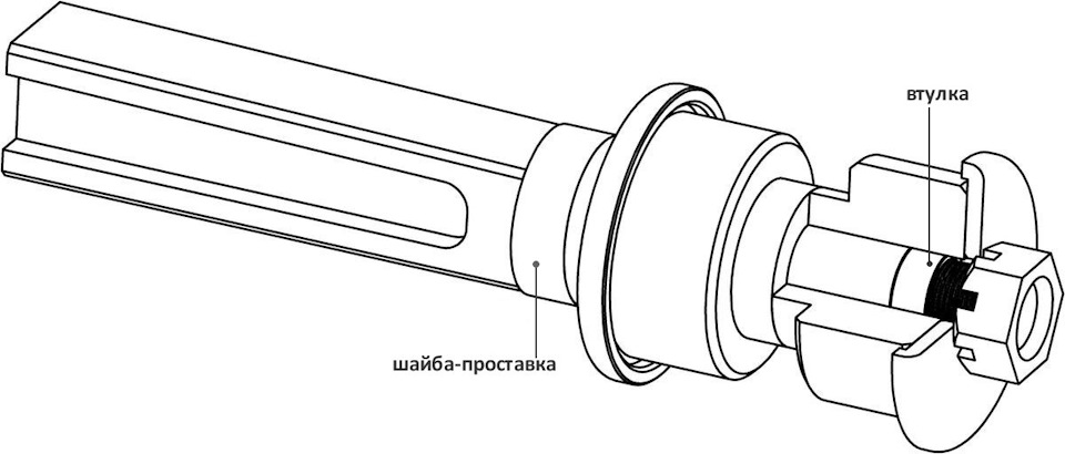 Можно поступить иначе: отодвинуть мост в первоначальное положение, и тем самым вернув кастор на место. Для этого потребуется удлинить плечо каждой продольной штанги 1, которая выравнивает мост. Сделать это можно подложив шайбу-проставку толщиной 10-15мм. Для защиты резьбы и выравнивания посадочного диаметра под шарниром подкладывают втулку такой же ширины, что и проставка.