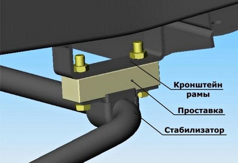 При сдвиге переднего моста необходимо будет установить проставку между мостом и передним карданным валом такой же толщины, что и шайба-проставка (аналогично тому как это делали с задним карданом). Кроме кастора и угла наклона карданного вала есть еще несколько моментов. Первый заключается в том, что уменьшается расстояние между карданным валом и стабилизатором поперечной устойчивости. На больших ходах подвески они могут встретиться друг с другом с последующими неприятными последствиями. Если вы не выезжаете на скоростные трассы, к примеру у вас автомобиль только для трофи, то стабилизатор можно вообще убрать. Остальным же придется установить проставки на кронштейн стабилизатора.