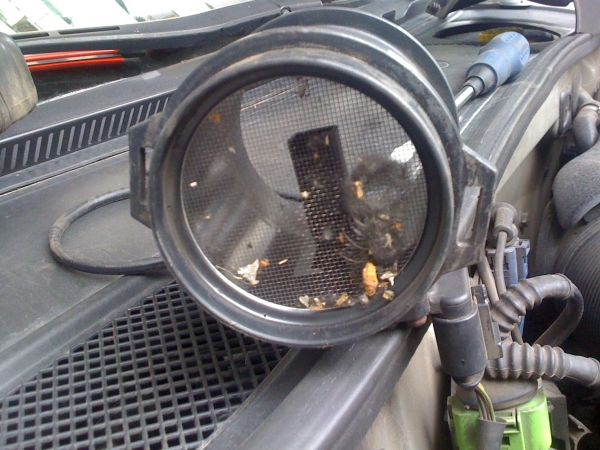 10. Впереди располагается вход, на котором должно располагаться уплотнительное резиновое кольцо. Оно служит для защиты от подсоса загрязненного, неочищенного воздуха. Если уплотнитель отсутствует, он зацепился за фильтр. Как результат, входная сетка ДМРВ будет загрязняться.