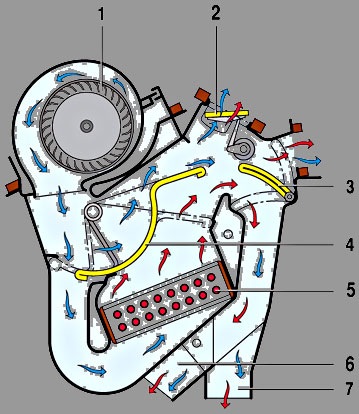 Печка состоит из вентилятора, заслонок, радиатора и воздуховодов. Синим и красным цветом обозначены, соответственно, потоки холодного и горячего воздуха1. Вентилятор. 2. Заслонка обдува лобового стекла. 3. Распределительная заслонка, направляющая потоки воздуха к центральному и боковым дефлекторам, в нижнюю и верхнюю часть салона. 4. Управляющая заслонка. 5. Радиатор печки. 6. Воздуховод, направляющий поток воздуха в ноги. 7. Внутренний воздуховод. Печка ВАЗ-2114 – интегрированная, с забором тепла от системы охлаждения двигателя и принудительной циркуляцией воздуха. Конструктивно отопитель салона у этой машины прост, что положительно сказывается на надежности системы. Радиатор установлен в корпусе отопителя. Помимо размещения составных элементов печки корпус предотвращает рассеивание потока воздуха и направляет его движение. Корпус печки соединен с воздуховодами, с помощью которых подаёт разогретый воздушный поток в зоны лобового и боковых стекол, в средину салона, к ногам водителя и переднего пассажира. Чтобы отрегулировать направление потока воздуха, на концах воздуховодов, подающих тепло к боковым стеклам и в средину салона, установлены дефлекторы.Причины плохого обогрева салона