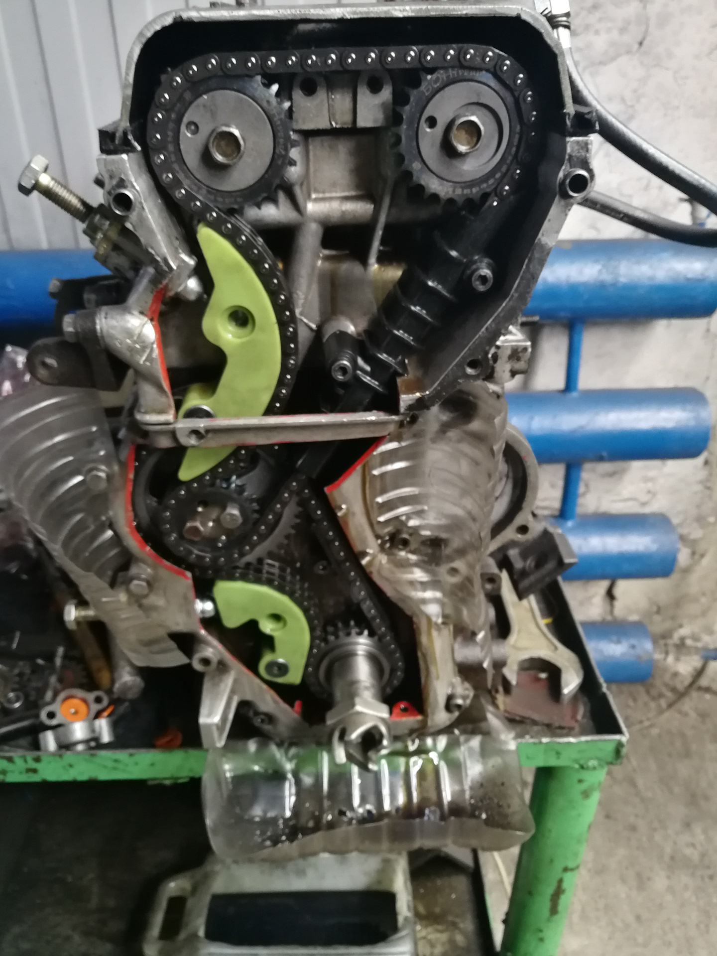 ПРИ УСТАНОВКЕ БАШМАКОВ: плюсы: 1. «мягкая» работа двигателя 2. почти нет износа цепей и шестерен ГРМ при том же пробеге, что и на звездах. 3. микро пыль, образующаяся от износа башмака натяжителя оказывает благоприятное антифрикционное действие на трущееся детали двигателя в целом. Пример тому: рабочие поверхности коренных и шатунных вкладышей на двигателе с пробегом около 400 тыс. км имеют вид только что установленных. 4. после пробега 140-160 тыс. км. можно обойтись только заменой башмаков натяжителей. минусы: 1. вероятность «перепрыгивания» меток ГРМ. (если доработать нижний башмак натяжителя), то этот пункт можно исключить. 2. вероятность не качественной пластмассы (в результате малый пробег автомобиля до замены) и залом верхнего болта крепления башмака натяжителя.