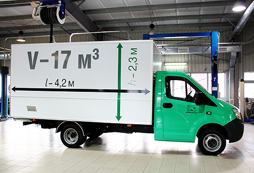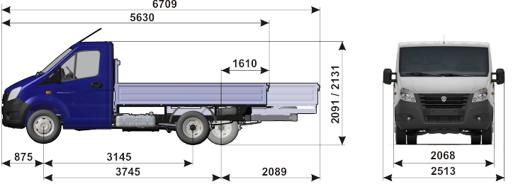 В любой из указанных версий ГАЗ предлагает покупателям относительно богатую базовую комплектацию БИ, в которую включены круиз-контроль, бортовой компьютер; подогрев боковых зеркал, электростеклоподъемники; центральный замок; регулируемая по высоте рулевая колонка, ГУР. Уровень оснащения К1 предполагает дополнительно: противотуманные фары; современную магнитолу с USB-разъемом и управлением на руле; электропривод боковых зеркал; подогрев водительского кресла. Доплатив, покупатель может получить топовую комплектацию К2, которая отличается от К1 наличием предпускового подогревателя, отопителя и аккумуляторной батареи повышенной энергоёмкости. Габаритные размеры • Стандартная база длина – 5,630 м; • ширина – 2,068 м; • высота – 2,137 м; • колесная база – 3,145 м; • радиус поворота – 5,6 м; • дорожный просвет – 170 мм; • передняя колея – 1,750 м; • задняя колея – 1,560 м; • снаряжённая масса – 2,060 т; • грузоподъемность – 1,440 т; • полная масса – 3,5 т; • максимальная скорость – 134 км/час.