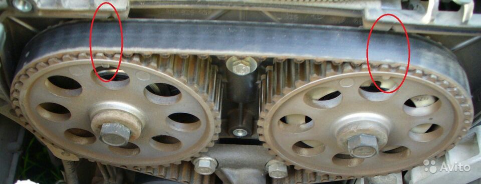 5. Проверяем, совпадают ли метки на шестернях распредвалов. Они должны совпадать с треугольными высечками на верхней части кожуха привода ГРМ.