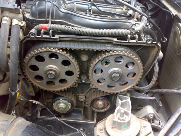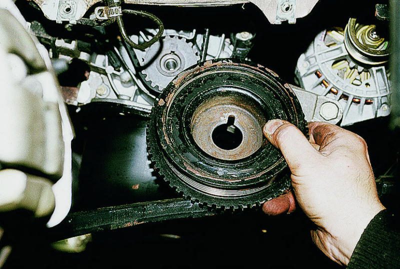 15. Новый ремень надеваем на шкив коленвала, шестерню помпы и на шестерни распредвалов.