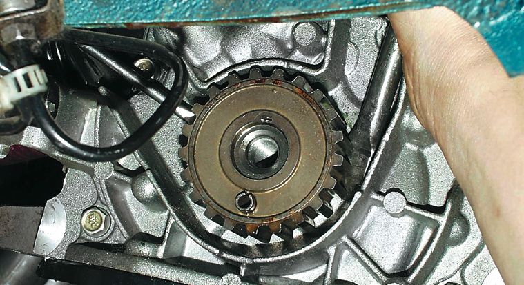 10. Под шкивом находится шестерня коленвала, на которой есть метка, она должна совпасть с меткой на боковой крышке масляного насоса.