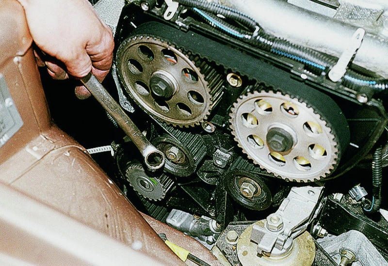 11. Если метки не совпадают, нужно выключить в автомобиле передачу, зафиксировав его стояночным тормозом, и ключом на 17, накинутым на болт шкива генератора, осторожно проворачивать коленвал до совпадения всех меток. Когда метки совпадут, значит, поршень 1-го цилиндра находится в верхней мертвой точке. Теперь можно снимать старый ремень. Перед этим фиксируем положение распредвалов деревянным бруском.