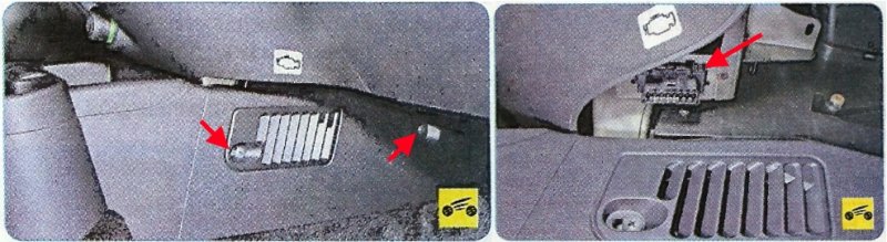 Диагностический разъем автомобиля предназначен для скоростного обмена данными с устройствами диагностики, что позволяет считывать и стирать коды ошибок, корректировать некоторые предустановки в RAM и считывать текущее значение параметров датчиков установленных на автомобиле. Таким образом, чтобы воспользоваться данными функциями нужно прежде всего знать, где в Гранте диагностический разъем. Диагностический разъем Гранты располагается слева от вещевого ящика (бардачка), над боковой вентиляционной решеткой в районе левой ноги пассажира. Чтобы получить к нему доступ придется открутить пару винтов крепления пластиковой панели.![]()