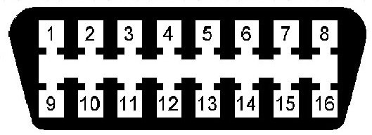 Разъем диагностики Гранты имеет тип ODB-II (16-ти контактный в форме трапеции), схема разъема представлена на фото: