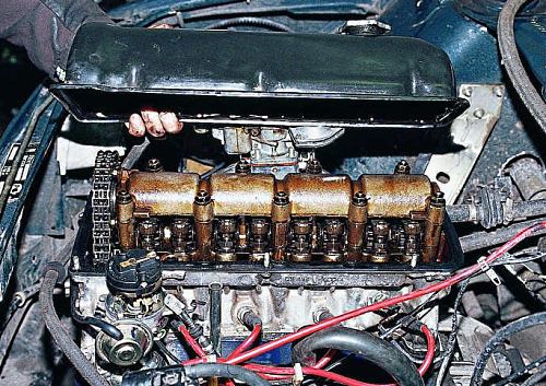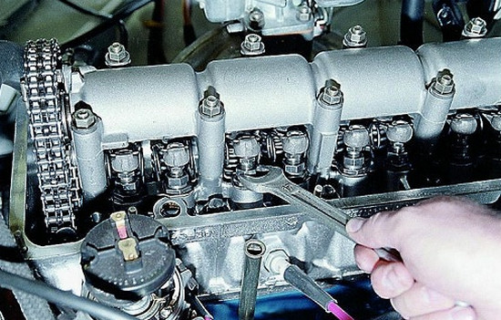 Шаг 1. Подготовьте инструмент. К нему можно отнести: ➤ рожковые ключи на 17 и на 13; ➤ 0,15-миллиметровый щуп (можно замерить микрометром); ➤ плоскую отвертку; ➤ набор торцевых головок и трещотку.Шаг 2. Удостоверьтесь, что соблюдены все необходимые условия: ➤ температура движка максимально приближена к температуре в гараже (на улице); ➤ ремень ГРМ имеет нормальное натяжение. Шаг 3. Снимите клапанную крышку. ➤ Выкрутите гайки крепления (3 шт.) крышки воздушного фильтра и снимите ее. ➤ Выньте сам фильтр. ➤ Вывентив 4 гайки крепления, отсоединив шланг сапуна, тросик подсоса и тягу привода заслонки карбюратора, демонтируйте оставшуюся часть корпуса воздушного фильтра. ➤ Открутите крепежные гайки (8 шт.) клапанной крышки – здесь вам пригодиться головка на 10 и трещотка — и снимите ее.