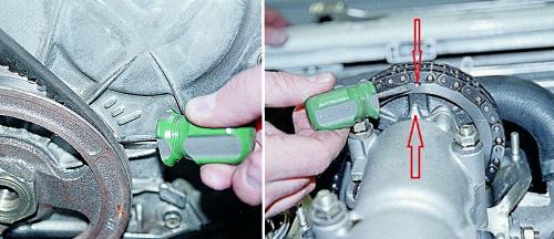 Шаг 4. Выставьте шкив коленвала и распредвала по отметкам. По сути, если натяжение цепи ГРМ было правильным, метки будут совпадать сами по себе – без регулировки. Однако в целях подстраховки, лучше все же перепроверять, совпадают ли метка шкива коленчатого вала и самая длинная метка на передней крышке карбюратора, а также метка шестерни звезды распределительного вала и выступ на крышке.